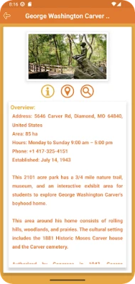 A Missouri Parks alkalmazás különös figyelmet fordít az állami és nemzeti parkok részletes bemutatására. Böngésszen a parkok széles választéka között, és találjon meg minden lényeges adatot, például pontos címeket, a rendelkezésre álló szolgáltatásokat, sőt még az RV parkolók és kempingek információit is. Az interaktív térképes funkcióknak köszönhetően könnyedén meghatározhatja az aktuális tartózkodási helyétől való távolságot, útvonalterveket kaphat, és fontos tájékozódási pontokat ismerhet meg a kiválasztott célpontokhoz. Az offline térkép teljes mértékben nagyítható, és interaktív érdekes pontokat (POI) tartalmaz, így internet-hozzáférés nélkül is navigálhat, biztosítva a zavartalan felfedezést.