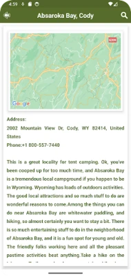 Merüljön el Wyoming gazdag történelmében, kultúrájában és jelképeiben; szerezzen tudomást a fővárosról és a híres helyekről, amelyek mind hozzájárulnak az állam egyedi vonzerejéhez. Ez az intelligens útmutató részletes listát biztosít Wyoming összes kempingjéről, beleértve azok közelében található látványosságokat és rendelkezésre álló szolgáltatásokat. A beépített funkcióval könnyedén megtalálhatja a táborhelyekhez vezető utat az aktuális tartózkodási helyétől, sőt, még offline is navigálhat a teljesen nagyítható térképpel, amely interaktív pontokat is tartalmaz a felfedezéshez. Érintsen meg bármelyik pontot a részletes információkért és útvonaltervezésért.